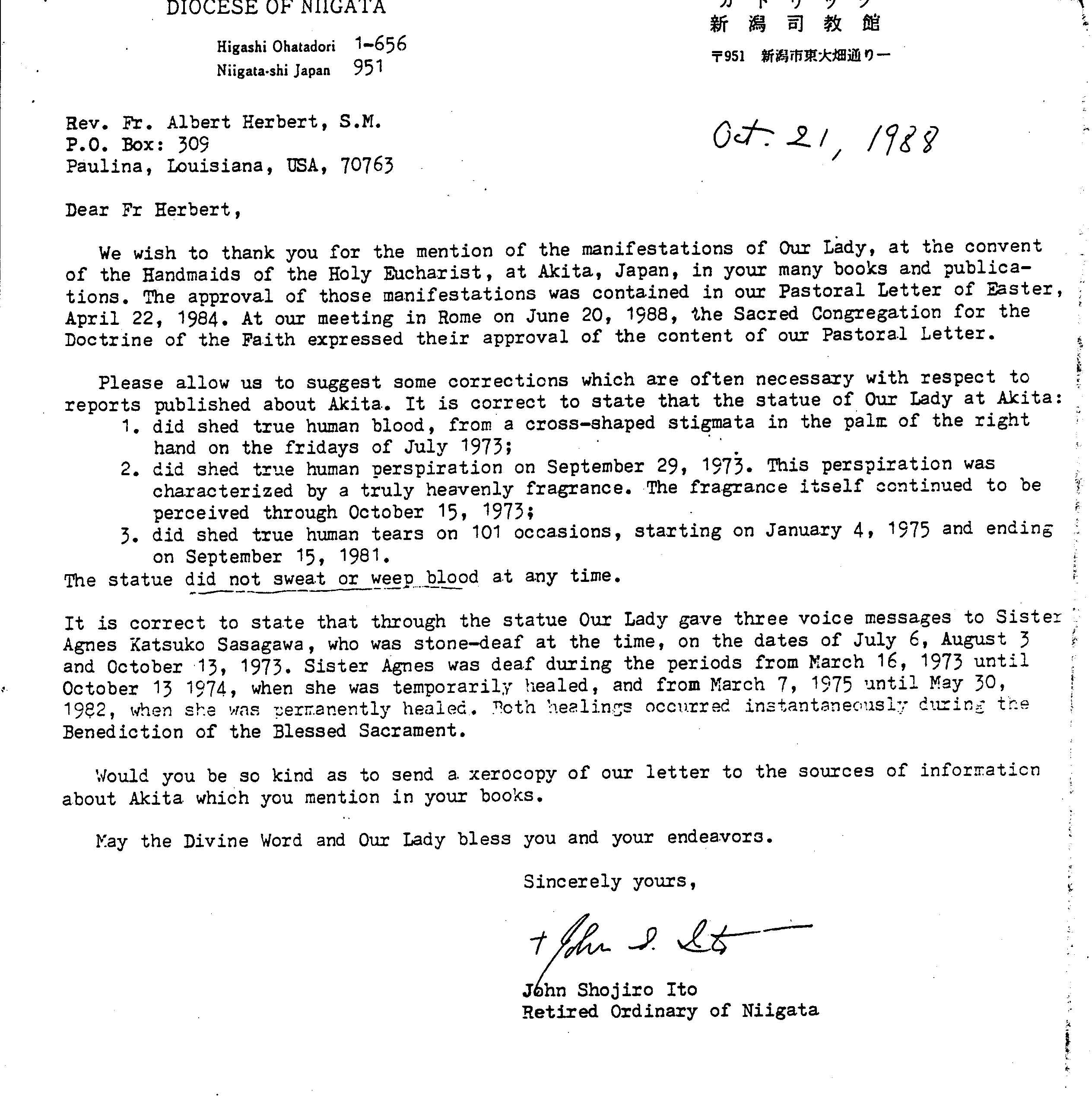 Letter of Approval signed and issued by M. Rev. John Shojiro Ito, Retired Ordinary of Niigata,