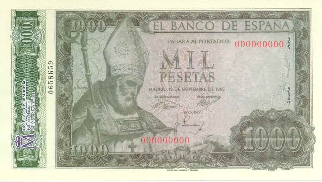 Nota de 1,000 Pesetas emitida por El Banco de España en el año 1965